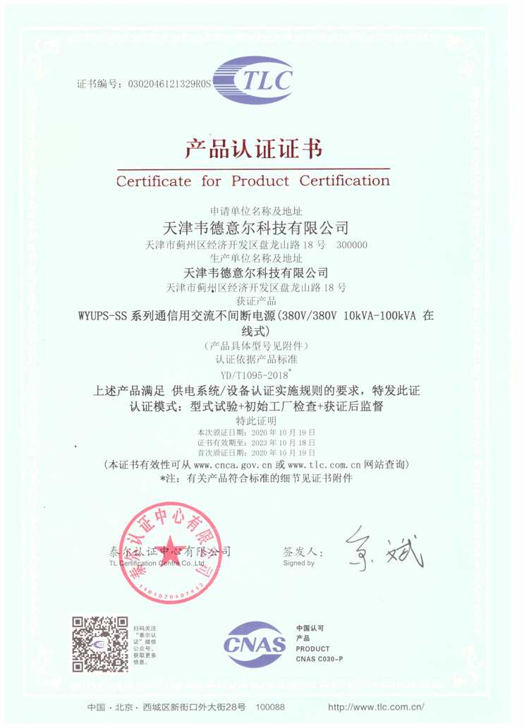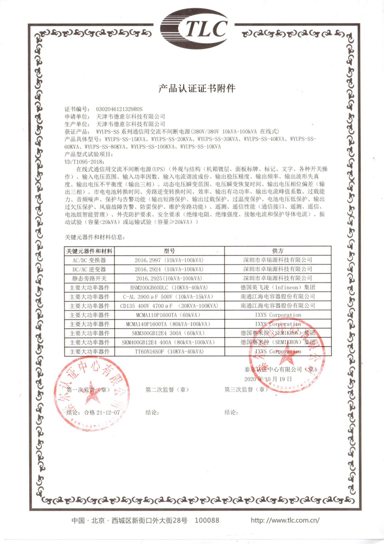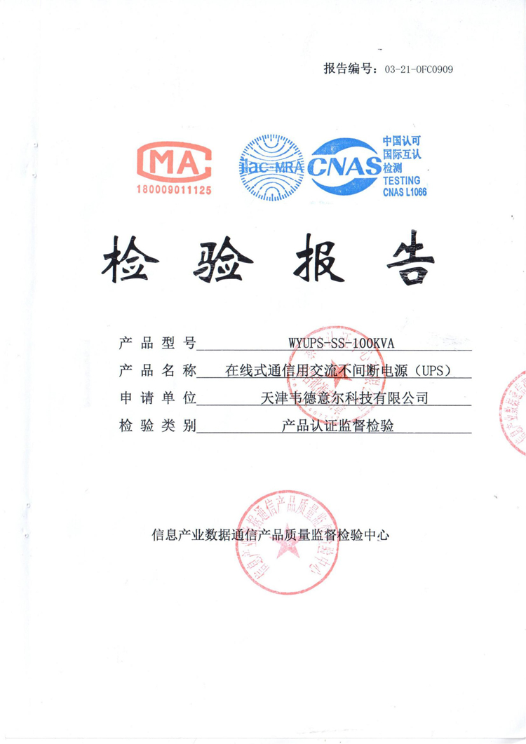 在線式通信用交流不間斷電源(UPS)100kVA泰爾認證證書及檢驗報告