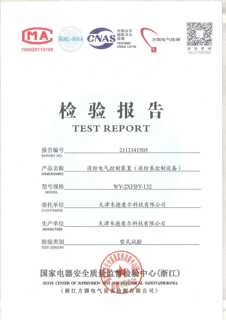 消防電氣控制裝置(消防泵控制設(shè)備WY-2XFBZ-132)認(rèn)證證書及檢驗(yàn)報(bào)告
