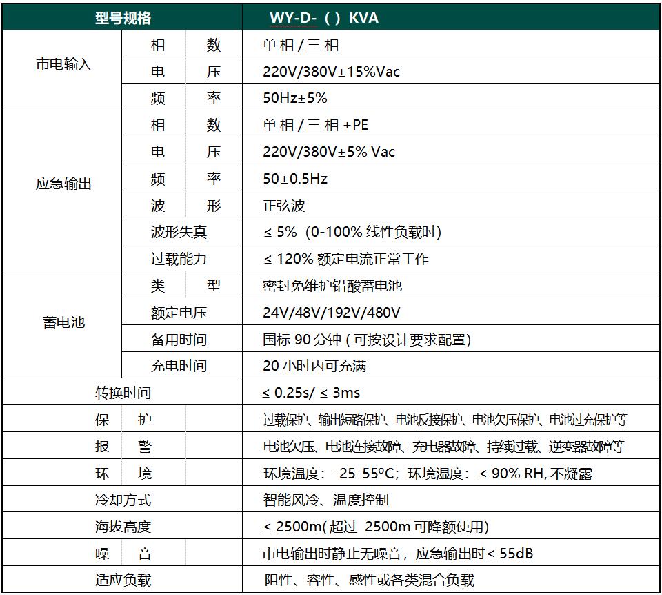 韋德意爾應急電源具有完善的保護功能,一旦出現(xiàn)下表所列故障,應急電源將進入逆變狀態(tài)或關閉輸出,以保證負載不受損壞,同時應急電源自身也得到保護。